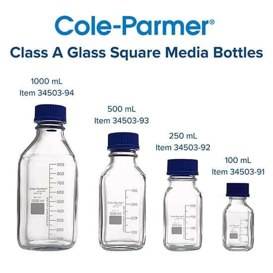 - Class A square glass media storage bottles ideal for mixing, sampling, and storing mixtures, reagents, solvents, and solutions in the laboratory